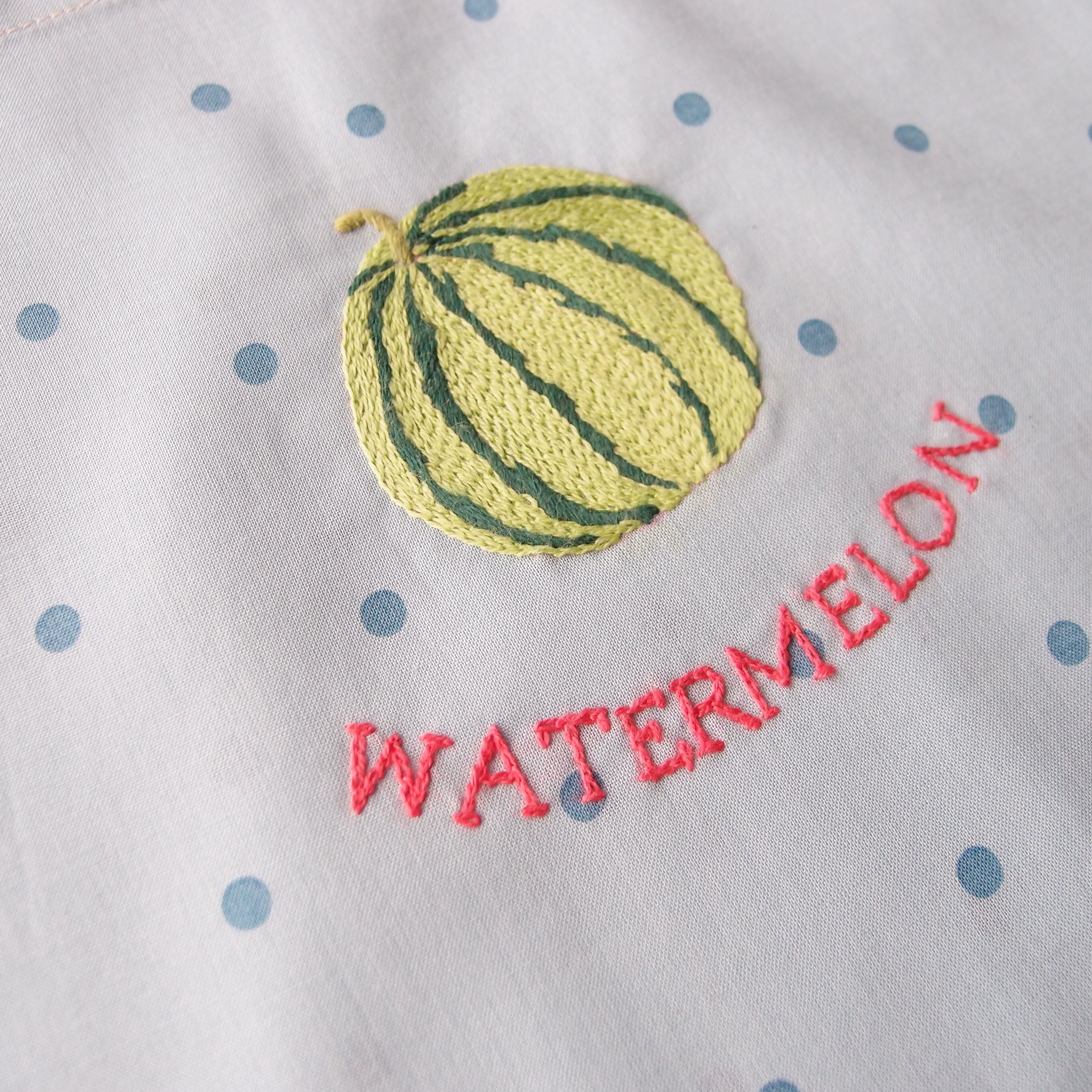 4回目となる今回のテーマは『すいか』。中に赤い果肉を秘めた神秘的なしましまの大きな球体をSunny Threadで描きましょう。涼し気な水色のドットがさわやかなオーガニックコットンのトートバッグにスイカの刺繍、夏の針仕事に、お出かけに、お楽しみいただけたらさいわいです。