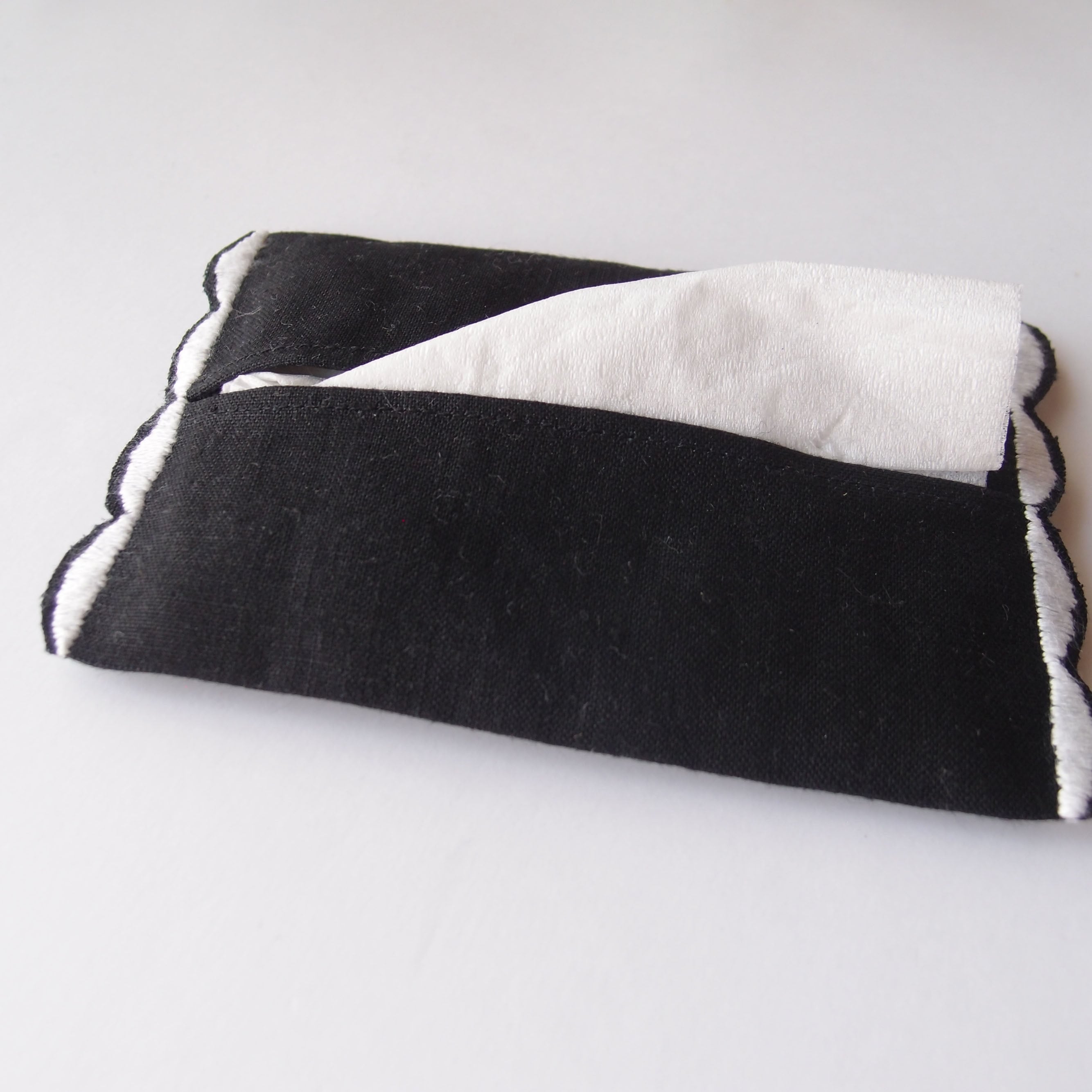 縁取りのスカラップを作りながら両脇を留めていき、ティッシュケースに仕立てていきます。ブラックによく映える白い波紋とスワンの刺繍を楽しんでくださいね。