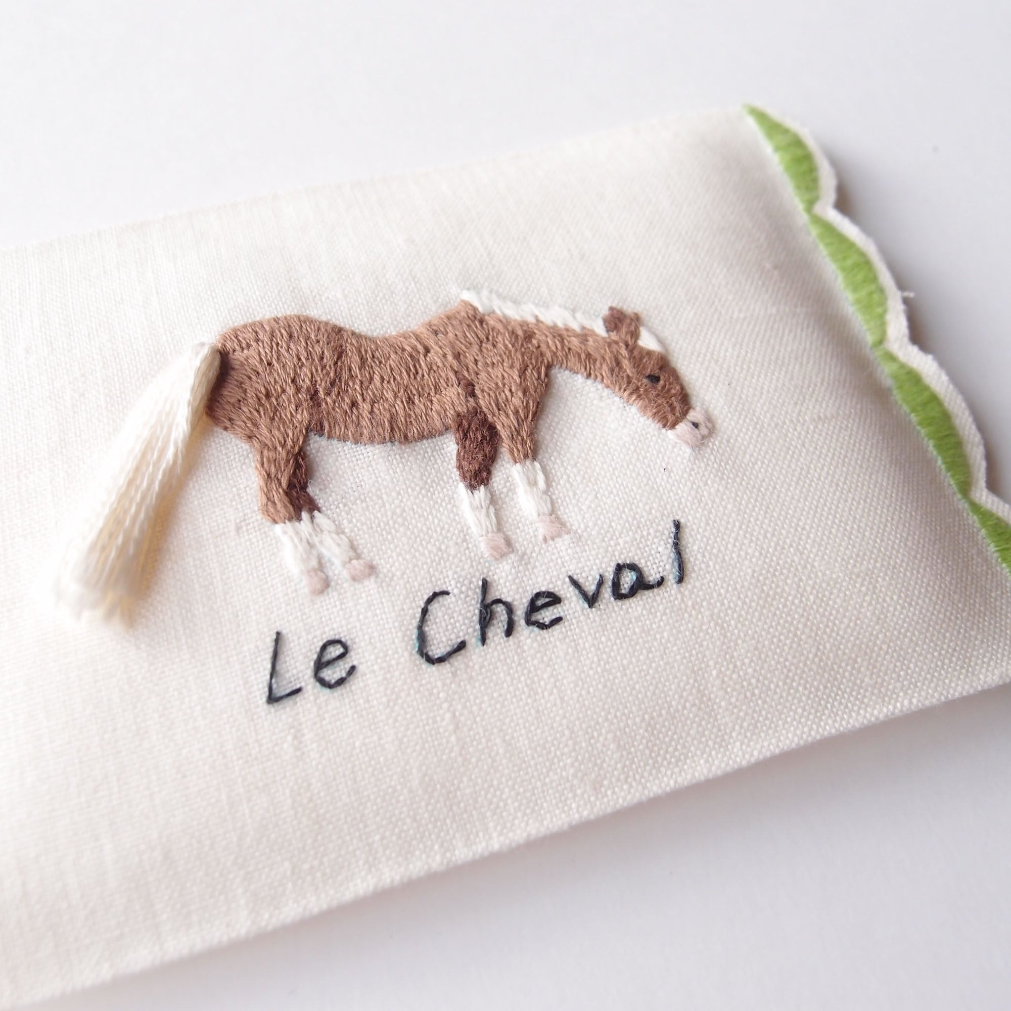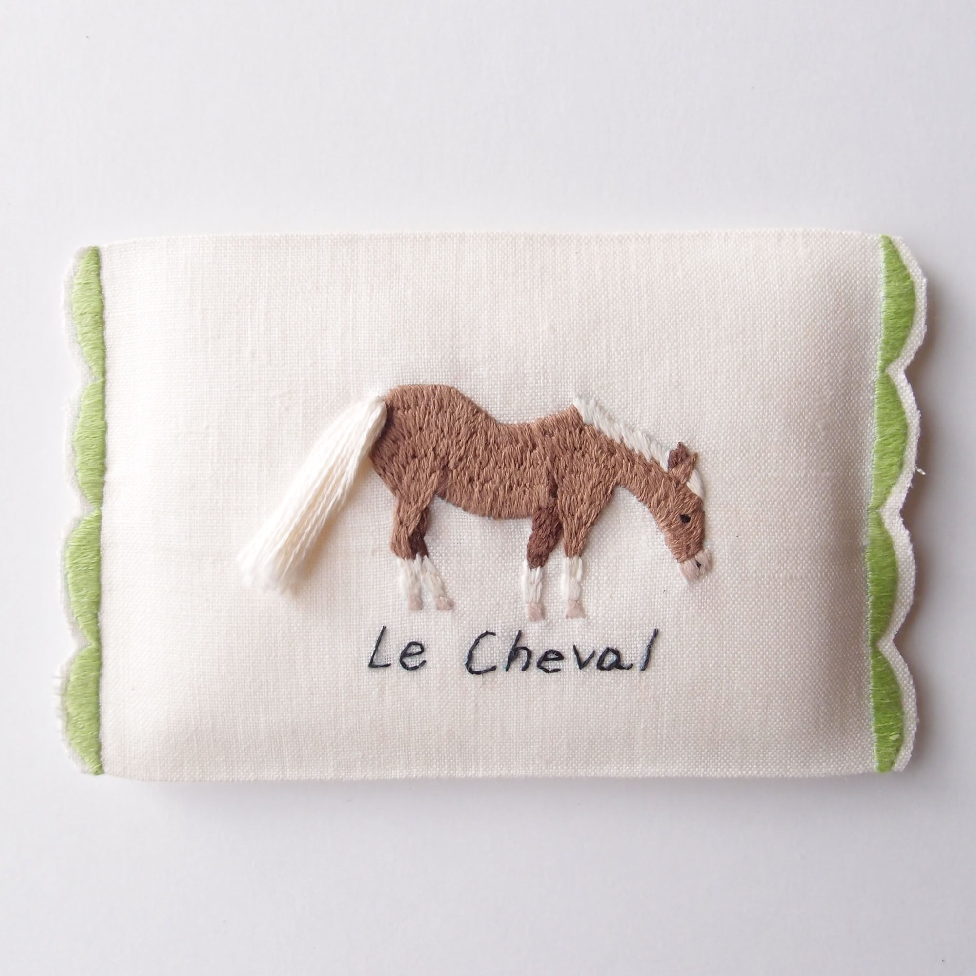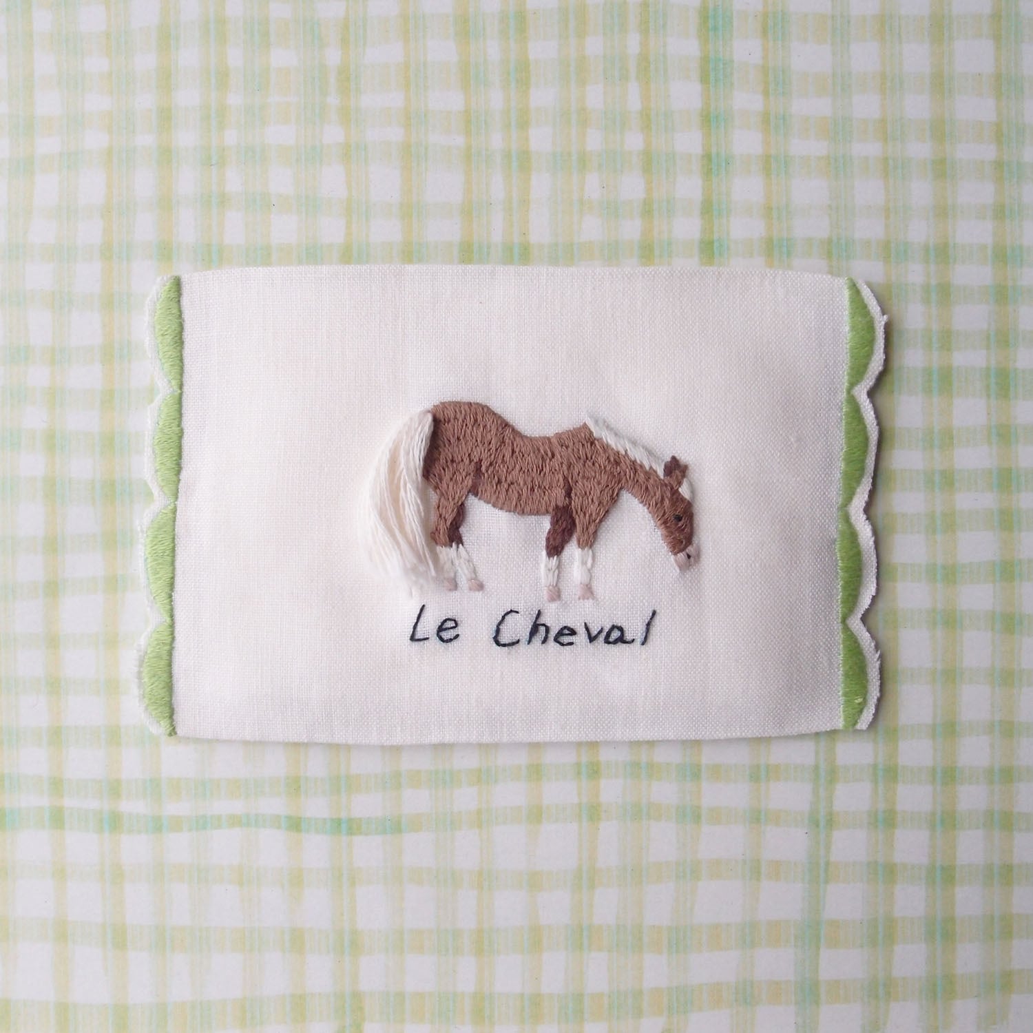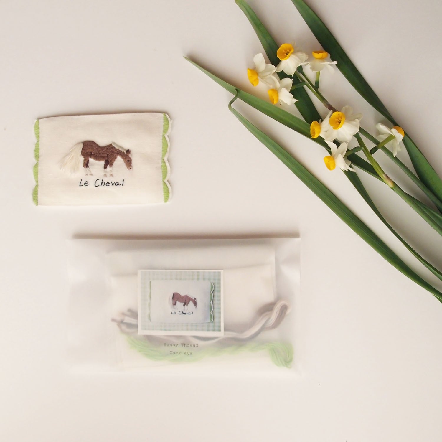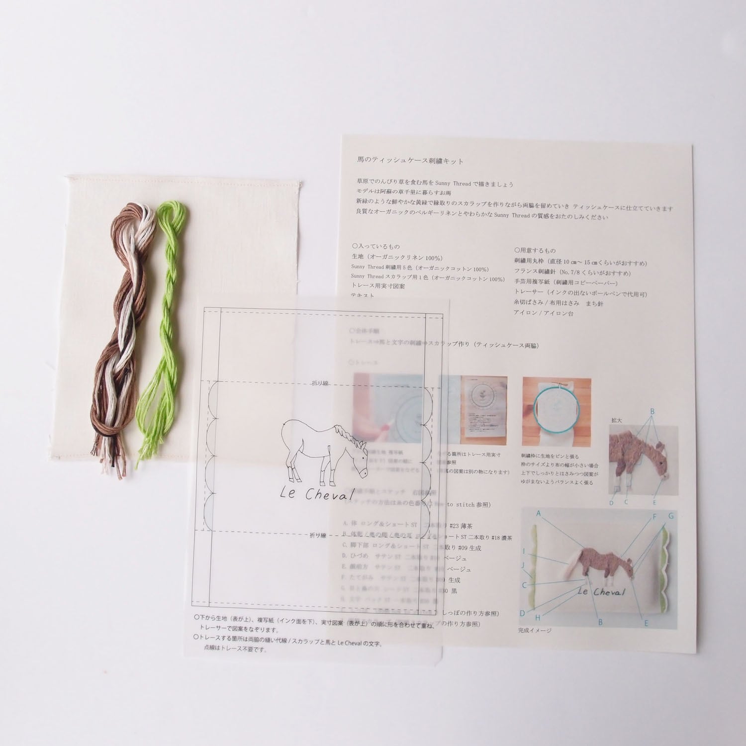 草原でのんびり草を食む馬をSunny Threadで描きましょう。モデルは阿蘇の草千里に暮らすお馬。新緑のような鮮やかな黄緑で縁取りのスカラップを作りながら両脇を留めていき ティッシュケースに仕立てていきます。